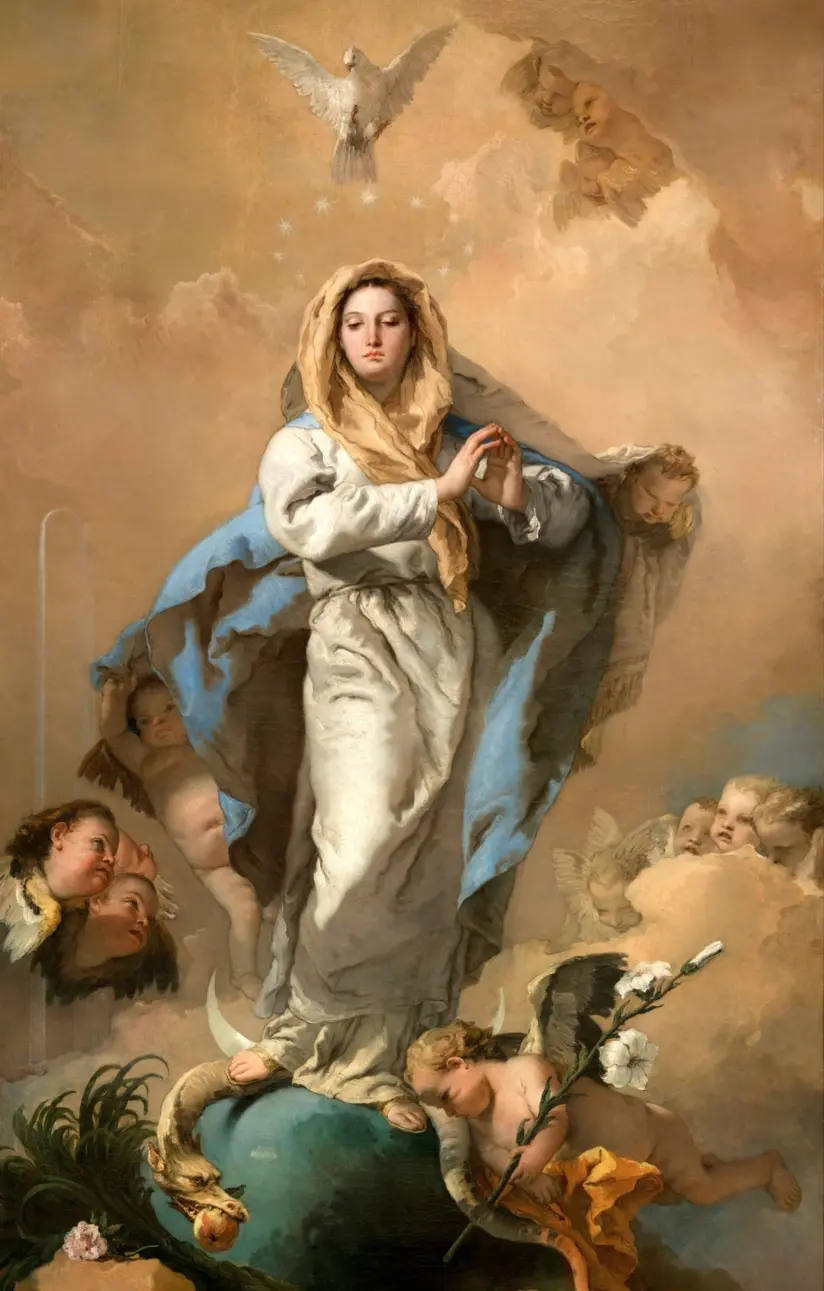 Dáng đứng của Đức Mẹ được gợi cảm hứng từ tuyệt tác hội họa “Đức Mẹ Vô Nhiễm Nguyên Tội” của họa sĩ Giovanni Battista Tiepolo (1696-1770). Đức Mẹ được miêu tả theo các truyền thống Công giáo với các biểu tượng đặc biệt như chim bồ câu và triều thiên 12 ngôi sao phía trên đầu Mẹ. Đức Mẹ Vô Nhiễm Nguyên Tội đứng trên một quả vầng trăng hình lưỡi liềm và đạp lên trên con rắn. Tay Mẹ chụm lại trong tư thế cầu nguyện.