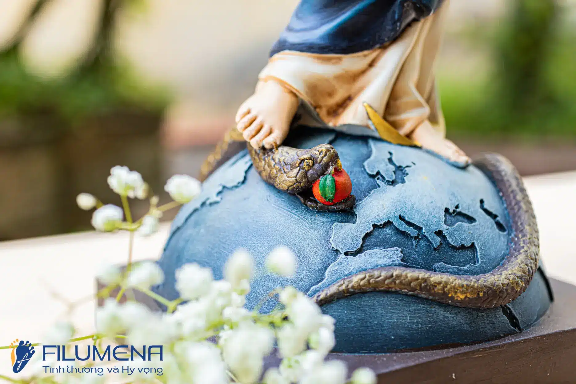 Tượng Đức Mẹ Vô Nhiễm Nguyên Tội miêu tả Mẹ với tước hiệu cao quý dựa trên một trong bốn đặc ân mà Thiên Chúa ban cho Mẹ: vô nhiễm tội tổ tông truyền.